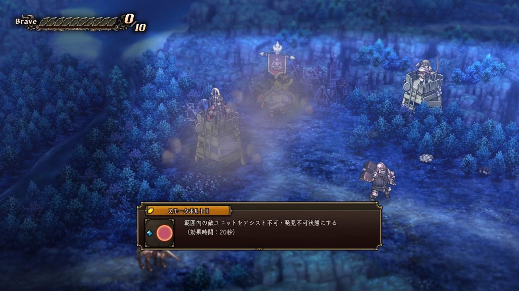 放置すると厄介なので、ブレイブスキル『スモークボルト』を使用し、アシスト攻撃を封印しよう。見張り台の敵は『歩兵』のみで構成されているので、『騎馬系』ユニットで戦闘するとスムーズに制圧できます。