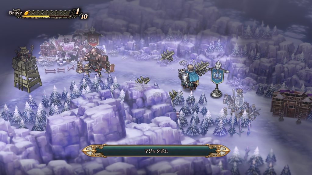 『敵本拠地』に駐留する『オーラ隊』は、前列に『ブレイカー』と『シールドシューター』、後列に『ソーサレス』、『ワーオウル』、『ビショップ』で構成されています。